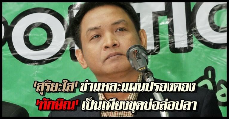"สุริยะใส" ชำแหละแผนปรองดอง "ทักษิณ" เป็นเพียงขุดบ่อล่อปลา ชี้เหตุที่ต้องเร่งรุกเพราะคะแนนนิยมตัว "ยิ่งลักษณ์" ดิ่งเหว ไร้ผลงาน หวังพับสนามบุก-ปิดเกมเร็ว เผยกลับบ้านเท่ๆ มุกเก่ากดดันเจ้าอภัยโทษฯ ฟันธงปรองดองฉบับแม้ว แค่มือสากปากถือศีล