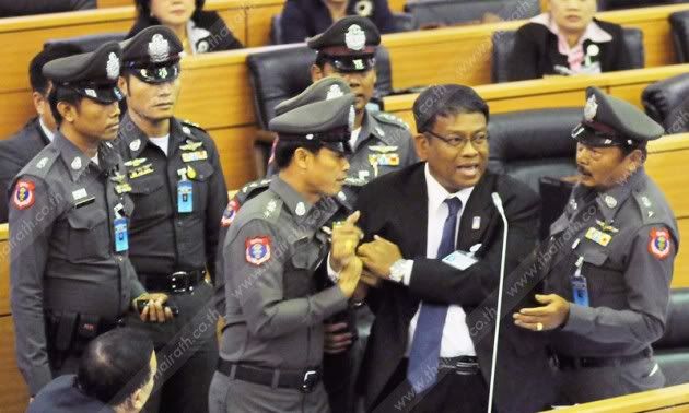 แต่เมื่อนายวัชระ เพชรทอง ส.ส.บัญชีรายชื่อ พรรคประชาธิปัตย์ ลุกขึ้นอภิปราย โดยมีเนื้อหานอกประเด็นและพาดพิงถึง พ.ต.ท.ทักษิณ ชินวัตร อดีตนายกฯ ทำให้ ส.ส.เพื่อไทย พากันลุกขึ้นประท้วงหลายรอบ ซึ่งนายสมศักดิ์ เกียรติสุรนนท์ ประธานการประชุมช่วงนี้ ขอให้อภิปรายให้อยู่ในประเด็นแต่นายวัชระ ยังคงพูดนอกประเด็นอยู่ นายสมศักดิ์จึงสั่งให้ยุติการอภิปราย แต่นายวัชระไม่ยอมหยุดในที่สุดนายสมศักดิ์จึงใช้อำนาจประธานด้วยการลุกจาก ที่นั่งพร้อมสั่งให้นายวัชระนั่งลง แต่นายวัชระยังไม่ยอมนั่ง ประธานฯจึงสั่งให้ตำรวจสภาฯนำตัวออกจากห้องประชุมโดยกำชับให้นำตัวออกไปอย่างสุภาพ แต่นายวัชระไม่ออกพร้อมปัดมือเจ้าหน้าที่ตำรวจสภาที่จะมาพาตัวออกไปนายสมศักดิ์จึงกำชับให้ตำรวจสภายกมือไหว้ และเชิญตัวออกไปอย่างสุภาพ ทำให้ ส.ส.ประชาธิปัตย์ หลายคนพากันลุกยืนประท้วง