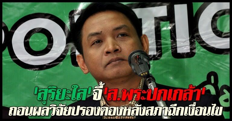 นายสุริยะใส ระบุอีกว่า เมื่อเป็นเช่นนี้ก็มีความจำเป็นที่ นายบวรศักดิ์ อุวรรโณ เลขาธิการสถาบันพระปกเกล้า ฐานะที่เป็นเจ้าของลิขสิทธิ์งานวิจัยต้องถอนรายงานการวิจัยออกมาทันที ตามที่ได้แถลงจุดยืนไว้ โดยไม่ต้องกลับไปขอความเห็นหรือมติจากสภาสถาบันพระปกเกล้าอีกแต่อย่างใด ตนไม่เชื่อว่าสถาบันพระปกเกล้าจะปล่อยเลยตามเลยหรือไม่สนใจในจุดยืนและเงื่อนไขการปรองดองที่ตัวเองประกาศไว้ เพราะถ้าเพิกเฉยหรือไม่รับผิดชอบต่อแถลงการณ์ที่เคยประกาศให้สังคมทราบก่อนหน้านี้ สถาบันพระปกเกล้า ก็หนีไม่พ้นต้องตกเป็นจำเลยสังคมอย่างแน่นอน เพราะที่ประชุมสภาผู้แทนฯ ซึ่งเมื่อวานไม่ใช่บรรยากาศของการนับหนึ่งการปรองดอง แต่เป็นการนับหนึ่งสงครามปรองดอง