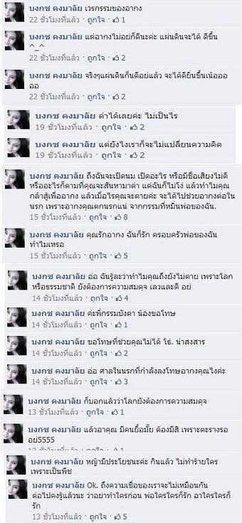 "เวรกรรมของอากงหากอากงไม่อยู่ก็ดีเหมือนกัน แผ่นดินจะได้ดีขึ้น ถึงฉันจะเปิดนม เปิดอะไร หรือมีชื่อเสียงไม่ดี หรืออะไรก็ตามที่คุณจะสันหามาด่า แต่ฉันก็ไม่โง่ แล้วทำไมคุณกล้าสู้เพื่ออากง แล้วเมื่อไหร่คุณจะตายค่ะ จะได้ไปช่วยอากงต่อในนรก เพราะอากงคุณตกนรกแน่ จากกรรมที่หมิ่นพ่อของฉัน คุณรักอากง ฉันก็รักครอบครัวพ่อของฉัน ทำไมเหรอ" ข้อความจากชื่อเฟซบุ๊ค “บงกช คงมาลัย“