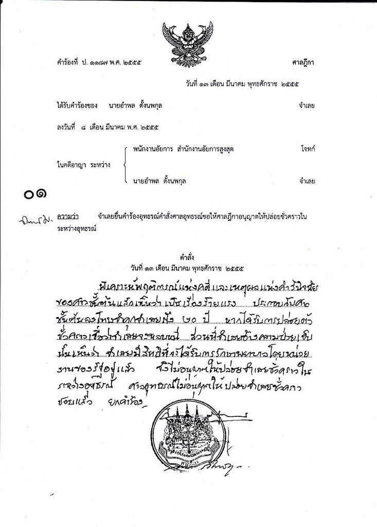 1. ทนายความได้ยื่นคำร้องขอปล่อยตัวชั่วคราวไปยังศาลอาญา ศาลอาญาให้ส่งเรื่องไปให้ศาลอุทธรณ์พิจารณาพร้อมกับอุทธรณ์เมื่อวันที่ 20 กุมภาพันธ์ 2555 ศาลอุทธรณ์มีคำสั่งไม่อนุญาตลงวันที่ 22 กุมภาพันธ์ 2555 "พิเคราะห์ความหนักเบาแห่งข้อหาและพฤติการณ์แห่งคดีกับพยานหลักฐานที่ศาล ชั้นต้นได้พิจารณาแล้วนับว่าร้ายแรง ประกอบกับข้อที่จำเลยอุทธรณ์โต้แย้งคำพิพากษาศาลชั้นต้น ยังไม่มีเหตุให้เชื่อว่าจำเลยไม่ได้กระทำความผิด หากให้ปล่อยตัวชั่วคราวไม่น่าเชื่อว่าจำเลยจะไม่หลบหนี และที่จำเลยอ้างเหตุความเจ็บป่วยไม่ปรากฏว่าถึงขนาดจะเป็นอันตรายแก่ชีวิตได้ ทั้งทางราชการก็มีโรงพยาบาลที่จะรองรับให้การรักษาจำเลยได้อยู่แล้ว จึงไม่อนุญาตให้ปล่อยตัวชั่วคราวในระหว่างอุทธรณ์ ให้ยกคำร้องและแจ้งเหตุการไม่อนุญาตให้ปล่อยชั่วคราวให้จำเลยและผู้ขอประกันทราบโดยเร็ว"