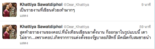 นางสาวขัตติยา สวัสดิผล (น้องเดียร์) สมาชิกสภาผู้แทนราษฎร แบบบัญชีรายชื่อพรรคเพื่อไทย อดีตหัวหน้าพรรคขัตติยะธรรม และเป็นบุตรสาวของ พลตรี ขัตติยะ สวัสดิผล (เสธ.แดง) โพสต์ทวิตเตอร์ส่วนตัว https://twitter.com/Dear_Khattiya ตอบโต้การเสนอรายงานความคืบหน้าคณะกรรมการอิสระตรวจสอบและค้นหาความจริงเพื่อการปรองดองแห่งชาติ (คอป.) ที่มีเนื้อหาบิดเบือนใส่ร้ายว่าพลตรี ขัตติยะ สวัสดิผล ว่ามีส่วนเกี่ยวข้องกับการเสียชีวิตของเจ้าหน้าที่รัฐในช่วงการสลายการชุมนุมของผู้เรียกร้องประชาธิปไตย (เหตุการณ์ 10 เมษายน 2553) ที่ถนนราชดำเนิน โดยนางสาวขัตติยา เขียนข้อความว่า