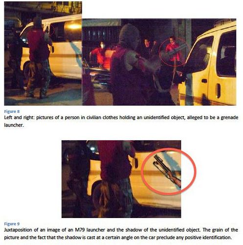 กรณีที่ คอป. เอาภาพถ่ายและการพิสูจน์ของผู้เชี่ยวชาญอิสระนิติวิทยา ศาสตร์ด้านอาวุธและกระสุนปืนจากต่างประเทศ มายืนยัน อย่างเช่นภาพในหน้า 99 ภาพที่เขียนว่า “Figure 8 คำบรรยายภาพในภาษาอังกฤษระบุว่า ”บุคคลในภาพถือวัตถุที่ไม่อาจจำแนกได้ มีเพียงข้อกล่าวหาว่าเป็นเครื่องยิงระเบิด” ส่วนภาพ “Figure 9” ยิ่งไปกันใหญ่ เป็นภาพเงาของวัตถุที่จำแนกไม่ได้เปรียบเทียบกับภาพของเครื่องยิงระเบิด M79 ซึ่งในคำบรรยายระบุว่า “สืบเนื่องจากความขุ่นมัว (grain) ของภาพและมุมของเงาสะท้อนที่ปรากฏบนรถยนต์ ทำให้ไม่สามารถจำแนกได้ว่าเป็นวัตถุอะไร” (The grain of the picture and the that the shadow is cast at a certain angle on the car preclude any positive identification.)