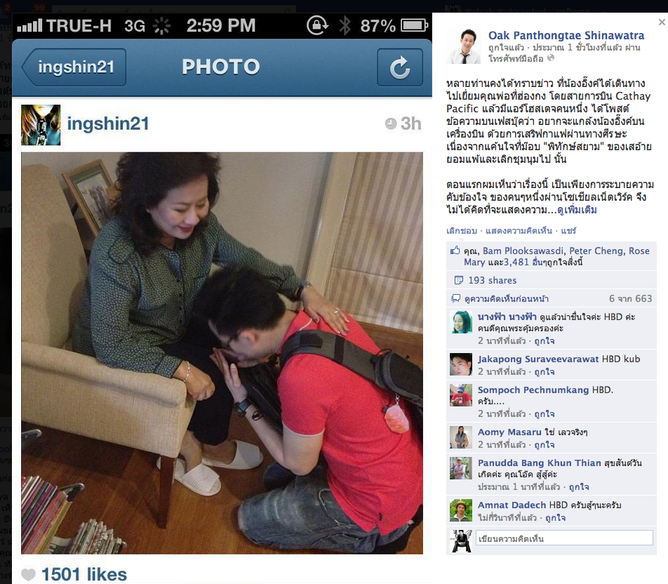 หลายท่านคงได้ทราบข่าว ที่น้องอิ๊งค์ได้เดินทางไปเยี่ยมคุณพ่อที่ฮ่องกง โดยสายการบิน Cathay Pacific แล้วมีแอร์โฮสเตจคนหนึ่ง ได้โพสต์ข้อความบนเฟสบุ๊คว่า อยากจะแกล้งน้องอิ๊งค์บนเครื่องบิน ด้วยการเสริฟกาแฟผ่านทางศีรษะ เนื่องจากแค้นใจที่ม๊อบ "พิทักษ์สยาม" ของเสอ้ายยอมแพ้และเลิกชุมนุมไป นั้น