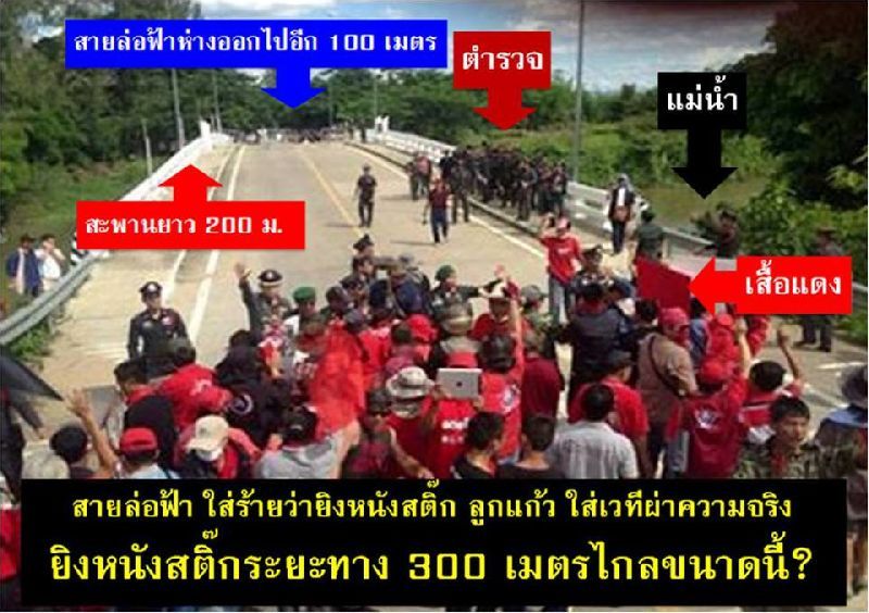 อย่างไรก็ตาม ล่าสุด ตำรวจสภ.เหมืองจี้ จ.ลำพูน สืบสวนคดีดังกล่าวโดยละเอียดแล้วพบว่า ผู้ต้องหาทั้ง 4 รายดังกล่าวมาร่วมฟังการปราศรัยของพรรคประชาธิปัตย์ และอ้างว่าได้ยินว่ามีคนเสื้อแดงยิงหนังสติ๊ก พวกตนจึงเดินจะไปยิงหนังสติ๊กที่บริเวณใต้สะพานข้ามแม่น้ำกวง กระทั่งถูกตำรวจจับกุมพร้อมของกลาง