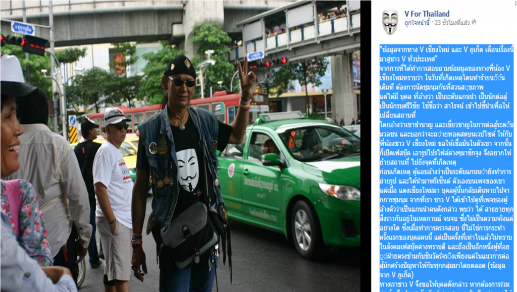 เพจ V for Thailand ได้แฉว่า จากเหตุการณ์ปะทะกันของกลุ่มคนเสื้อแดงและหน้ากากขาวที่จังหวัดเชียงใหม่เมื่อปลายสัปดาห์ก่อนนั้น ต้นเหตุเกิดจากแกนนำนักรบศรีวิชัยคนดังเจ้าของเพจ “สาโรจน์ ขอเป็นข้ารองพระบาท ทุกชาติไป” ได้หลอกพาคนหน้ากาก V เชียงใหม่ ย้ายสถานที่จากสวนสุขภาพไปชุมนุมอีกแห่งเพื่อเกิดการปะทะทำร้ายร่างกายกัน เมื่อเกิดการปะทะ นักรบศรีวิชัยคนดังก็จะหลบหายตัว แต่จะอัพเดทภาพการปะทะ สร้างภาพตนเป็นวีรบุรุษในสงคราม อีกทั้งนักรบศรีวิชัย “สาโรจน์” คนนี้ได้เดินสายปลุกปั่นให้สาวกพันธมิตรออกไปปะทะอยู่บ่อยครั้ง โดยเอาชีวิตพี่น้องประชาชนเข้าแลกเพื่อให้ตัวเองได้ชื่อเสียง โดยเพจ V For Thailand ได้เขียนข้อความไว้ดังนี้